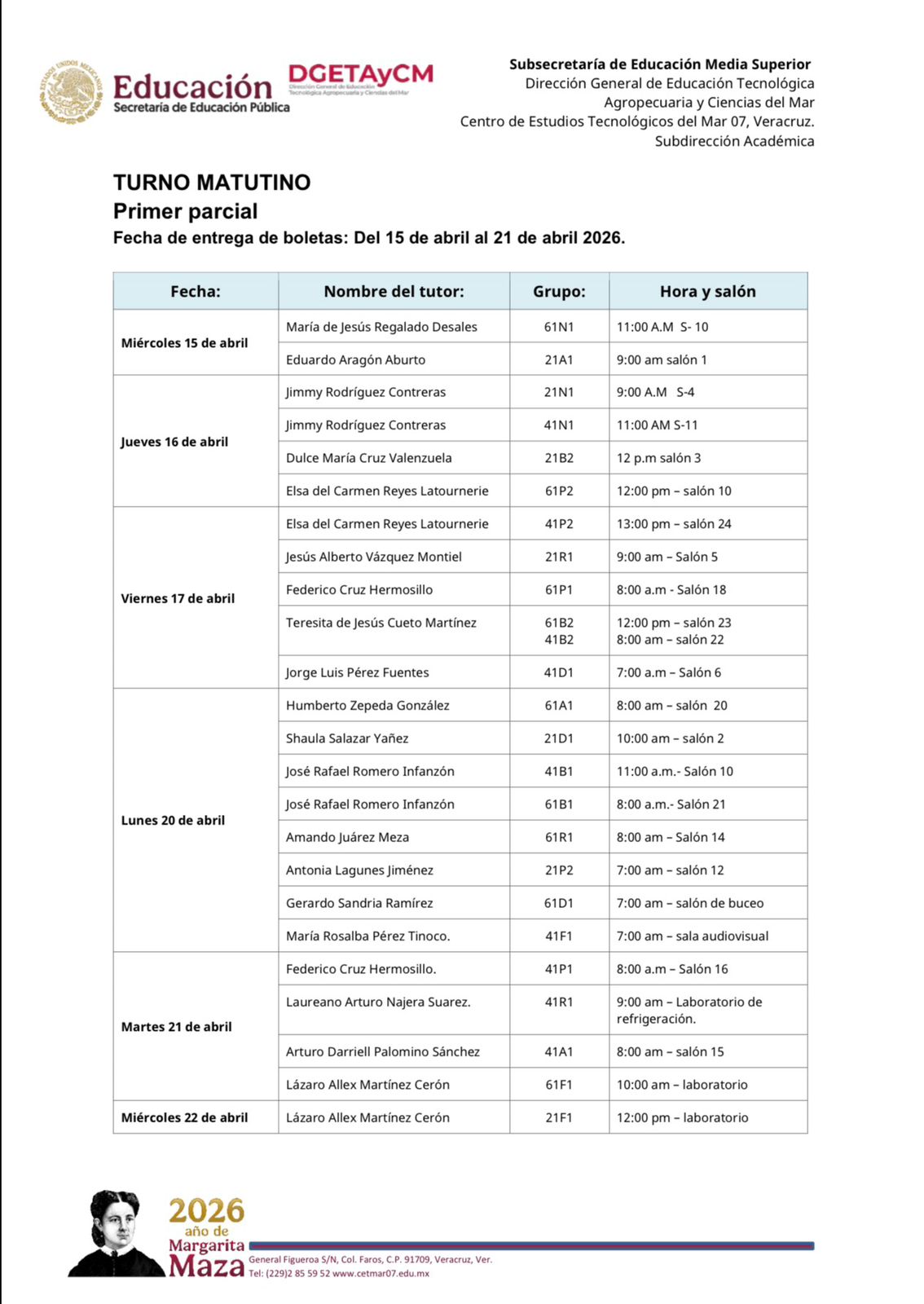 SE COMUNICA A LOS PADRES DE FAMILIA Y TUTORES DEL TURNO MATUTINO QUE LA ENTREGA DE BOLETAS CORRESPONDIENTE AL PRIMER PARCIAL SE LLEVARA A CABO DEL 15 AL 22 DE ABRIL DE 2026 DE ACUERDO AL HORARIO Y LUGAR ASIGNADO PARA CADA GRUPO SEGUN LA PROGRAMACION OFICIAL DEL PLANTEL POR LO QUE SE LES SOLICITA PUNTUAL ASISTENCIA PARA CONOCER EL DESEMPEÑO ACADEMICO DE SUS HIJOS.