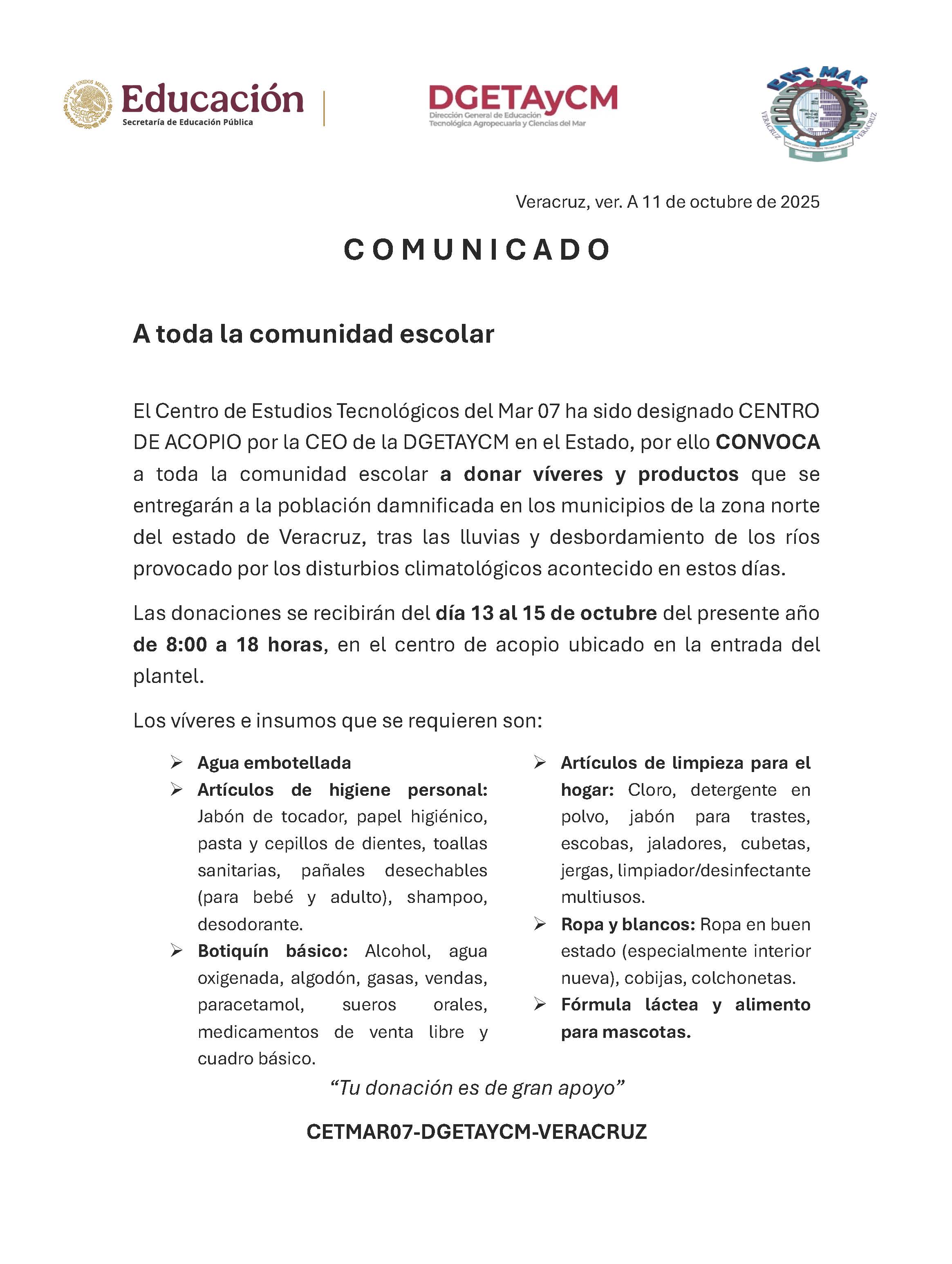 Al personal docente y de asistencia y apoyo a la educación, estudiantes, padres de familia o tutores y miembros de la comunidad en general, al evento público de presentación del informe de actividades y rendición de cuentas del C. ING. GUSTAVO GONZÁLEZ GARCÍA DIRECTOR DEL PLANTEL CETMAR NO. 07 VERACRUZ, VER., correspondiente al CICLO ESCOLAR 2024-2025, que tendrá verificativo el 10 DE SEPTIEMBRE DEL 2025 en el horario de las 12:00 HORAS MD. En el lugar que ocupa LA SALA AUDIOVISUAL DEL EDIFICIO D DEL PLANTEL, con una duración de una hora.